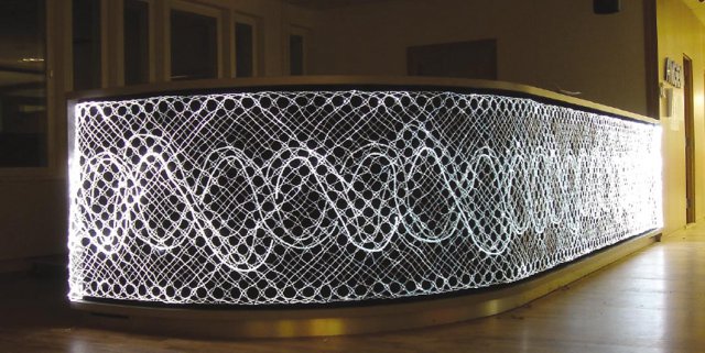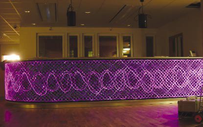 Всего 128 нитей. Каждая нить состоит из 7 оптических волокон бокового свечения диаметром 0,75мм в прозрачной виниловой оболочке диаметром 3мм. К каждой нити прикреплен стеклянный шар диаметром 30мм.